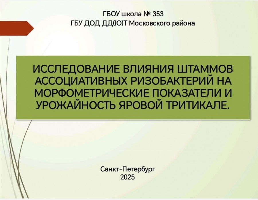 Продолжением лектория стало выступление ученицы ГБОУ школы № 353 Касымовой Евгении. Её исследовательская работа была посвящена изучению влияния штаммов ассоциативных ризобактерий на морфометрические показатели и урожайность яровой тритикале.